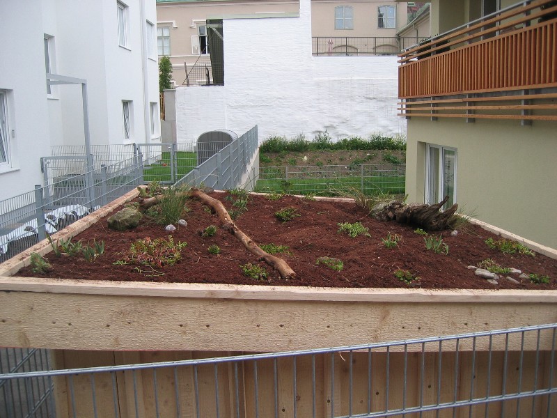 2008 - Begrünung eines Gartenschuppens 5cm Dachsubstrat mit Ziegelsplitt, bepflanzt mit Sukkulenten
