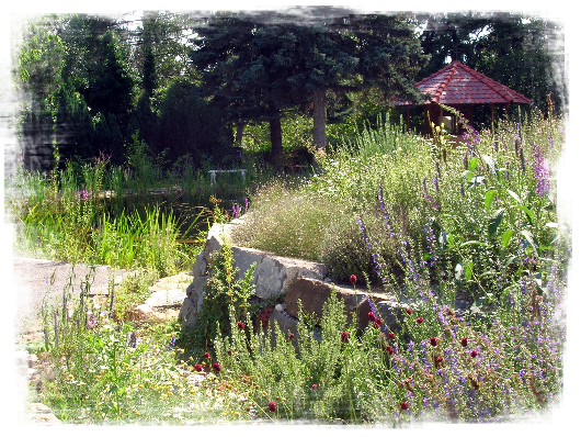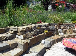 Lösung: es wurden im Wesentlichen zwei Ebenen errichtet, die des Schwimmteichs, und die Rasenebene oberhalb. Beide wurden mittels einer Naturstein – Trockenmauer (Sandstein) abgegrenzt. An der Maueroberkante entstand ein ca. 50m² großes Beet mit Kräutern und bunten Stauden. Bei der Farbgebung wurden nach Wunsch der Hausherrin Richtlinien des feng shui berücksichtigt. Mit Hilfe von Trockenmauern und Treppen aus Naturstein wurden mehrere unabhängige Plätze geschaffen.