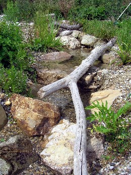 Lösung: Der Schwimmteich bildet das zentrale Element im Garten, um ihn herumwandernd kann man den ganzen Garten genießen; ein kleiner Bachlauf verbindet den Schwimmteich mit den großflächigen Staudenbeeten am Rand.