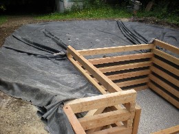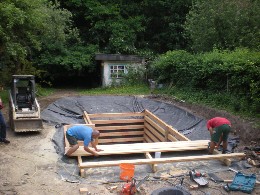 Aufgabenstellung: der Teich sollte eher klein sein, mehr zum Abkühlen als zum Schwimmen, und nur die Anschlüsse für einen eventuellen späteren Einbau von Wassertechnik bieten.