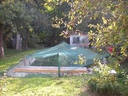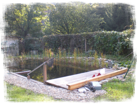 Lösung: Es entstand ein 54m² großer Teich; davon werden 18m2 zum Baden genutzt, der Zugang erfolgt über eine Treppe mit Unterwasserpodest, auf dem auch Nichtschwimmer gut stehen können. Das Sonnendeck liegt zweischen Wohnhaus und Schwimmteich im sonnigsten Bereich des Gartens.