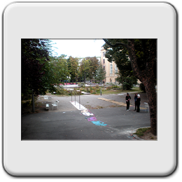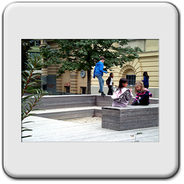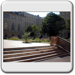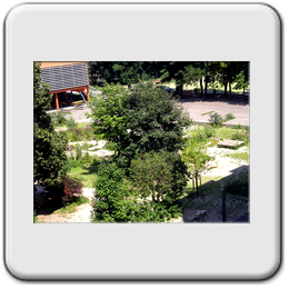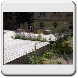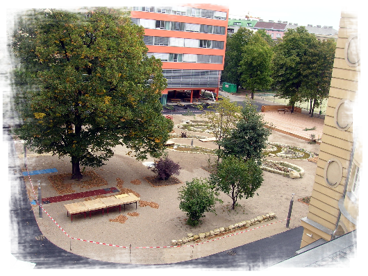 Beschreibung: Die gesamte Freifläche umfaßt 8000m², wovon 4500 zur Neugestaltung zur Verfügung standen. Die Situation ist Innenhof – artig, mit altem Baumbestand.