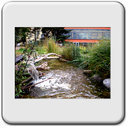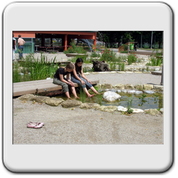 Naturgarten: der 200m lange Bachlauf mit Teich und Quellbecken ist Ökozelle und Spielplatz in einem