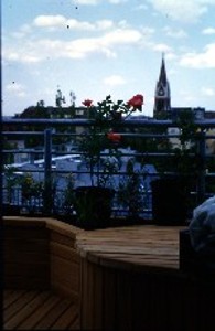 Mit Liegedeck und Miniteich mit Sprudelstein und Bambus; Pflanztröge sind Spezialkonstruktionen aus Lärchenholz mit Abdichtung aus Kautschukfolie. Bepflanzung mit mediterranen Kräutern wie Heiligenblume, Rosmarin und Lavendel.